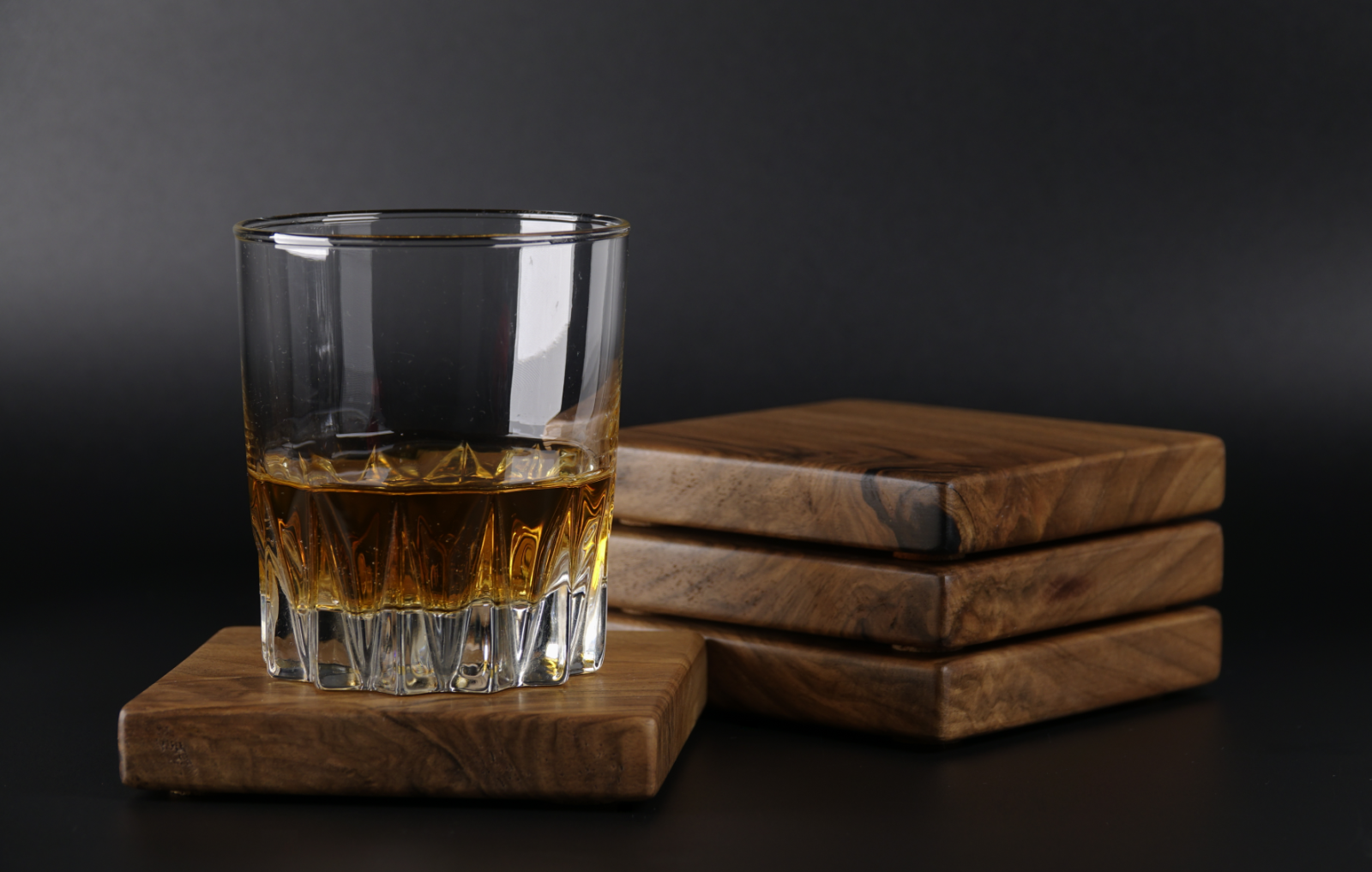 Set premium de 4 suporturi pentru pahare din lemn masiv de nuc, cu inserții fine din rășină epoxidică ce creează un efect vizual inspirat de relieful montan.